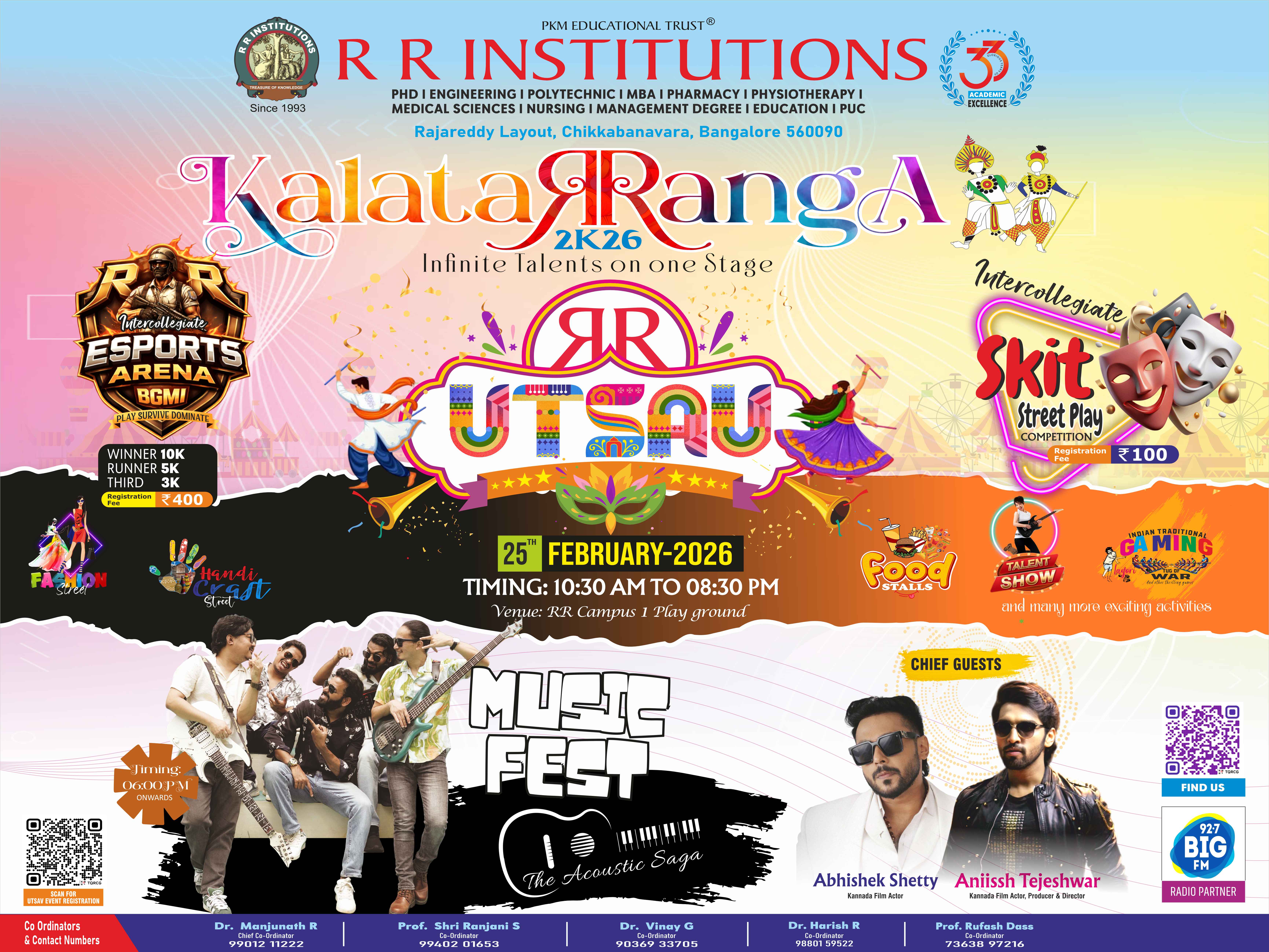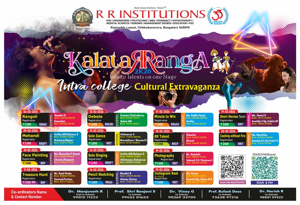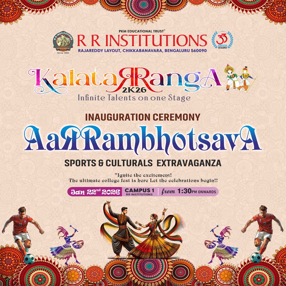KalataRRanga - Annual Sports & Cultural event is a flagship brand of RR Institutions started in the year 2014. This year, KalataRRanga-2K26 promises to be an exhilarating month-long celebration, featuring a diverse range of activities to captivate every audience. We are thrilled to announce the grand celebration of KalaTaRRangA 2K26, Bengaluru's most significant Sports & Cultural extravaganza, marking its 13th glorious year as the flagship event of R.R. Institutions.